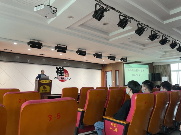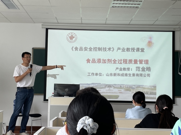 瑞福油脂股份有限公司董事长崔瑞福和山东新和成维生素有限公司副总经理范金皓作为missav missav 产业教授,分别带领学生观摩其企业具体生产工艺,并以实际生产过程为例,为学生讲授食品加工过程中的安全控制技术。