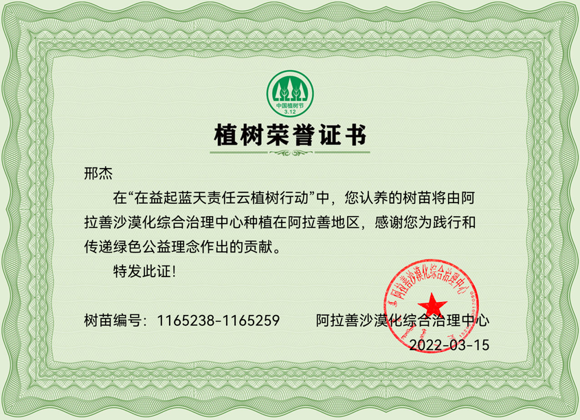 捐赠的绿树将种植在内蒙古阿拉善地区巴丹吉林、腾格里、乌兰布和三大沙漠。阿拉善地区是黄河进入内蒙古的第一站,土地荒漠化曾严重,我国华北、沿海地区出现的沙尘暴,绝大部分和它有直接关系。