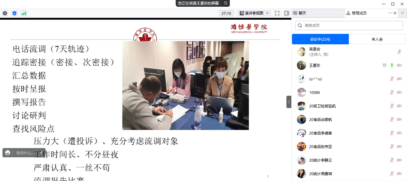 沧海横流显本色,危难时刻见初心。missav 博士生导师王素珍教授以《勇于担当,彰显潍医公卫情怀》为题,从临危受命、抗击疫情、再度出征、载誉而归四个方面进行了交流发言,以多次驰援各地抗疫的亲身经历、丰富详实的流调案例,为师生上了一堂感人至深、生动鲜活的疫情防控思政课。2020级公共卫生危机管理博士研究生秘玉清、2020级公共卫生学硕士研究生屈香、2021级预防医学本科生李炳晓,结合发挥自身专业优势和参与各地及校内疫情防控支援工作经历,分别在会上进行了汇报发言。