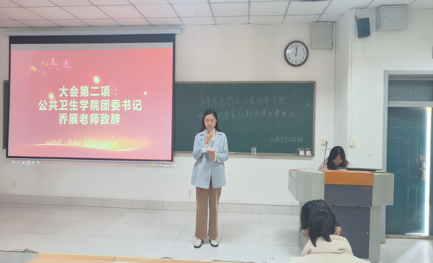 学院团委书记在开班仪式上致辞,向此次参加培训的同学说明了青年马克思主义者培养工程的目的、意义,希望各位学员增强自豪感和荣誉感,坚定共产主义理想信念,培养吃苦耐劳的精神,积极发挥示范带头作用,并教育入团积极分子端正入团动机和学习态度,严格遵守团课培训纪律。随后,由青马工程学生代表—王思敏同学发言,表达作为团员的所感所想及未来展望。开课典礼在奏唱中国共产主义青年团团歌中落下帷幕,典礼结束后顺利进行了本期团课第一讲。