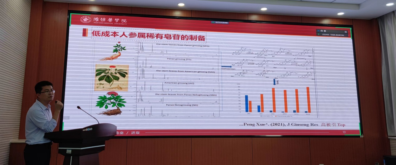 薛鹏在报告中着重讲述了合成法精确制备人参稀有皂苷的研究背景、研究思路、发展前景以及该项技术产业化的成功经验等。参会的青年博士们与薛鹏进行了深入交流,表达了充分利用各自研究优势参与合作研究的愿望。