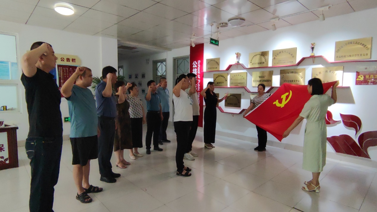 2023年6月30日,为深入开展学习贯彻习近平新时代中国特色社会主义思想主题教育,庆祝中国共产党成立102周年,预防医学党支部组织支部党员和上半年新发展的两名教师党员,面向党旗,进行新党员入党宣誓、老党员重温入党誓词仪式。