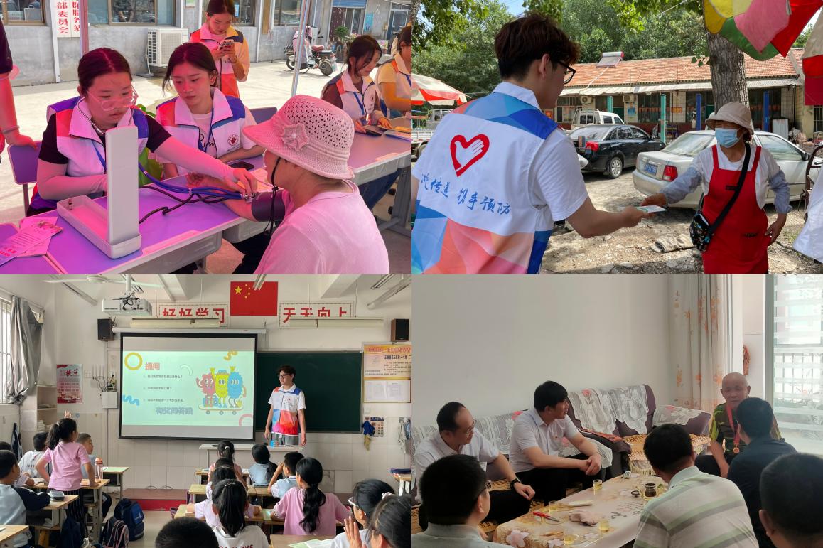志愿服务队员在专业老师的指导下进行义诊服务,为村民们测量血压、发放《健康手册》,向村民普及慢性病、传染病发病特点和预防措施;志愿服务队员走进当地幼儿园,开展知识讲座、知识问答、心肺复苏模拟等活动,向儿童们科普良好的健康知识理念,培养他们的急救技能;活动中志愿服务队员对活动区域进行卫生打扫和垃圾清理,营造良好卫生环境