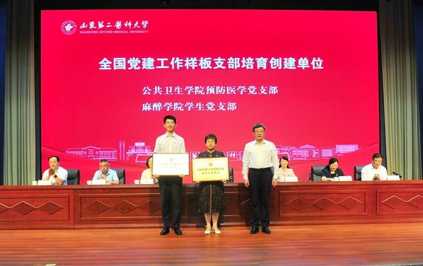 预防医学党支部书记王春平同志应邀做题为:“不忘初心担使命,教书育人谱新篇”的大会发言,并代表支部上台领取全国党建工作样板支部创建培育单位奖牌。