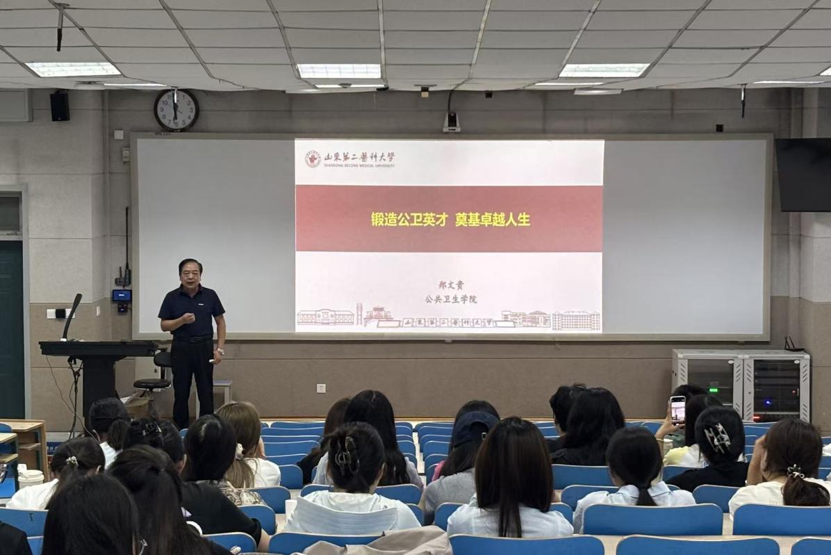 郑文贵首先代表学院对新生表示欢迎,以《锻造公卫英才,奠基卓越人生》为题,从学校发展历程、学院学科建设特色和人才培养体系架构等方面展开分享,并从思想引领、学业规划、能力培养等维度引导同学们深刻理解公共卫生事业在“健康中国2030”战略中的核心地位,勉励同学们将个人学术追求融入行业发展与社会需求,努力成长为心怀家国、勇于担当的高素质公共卫生人才。