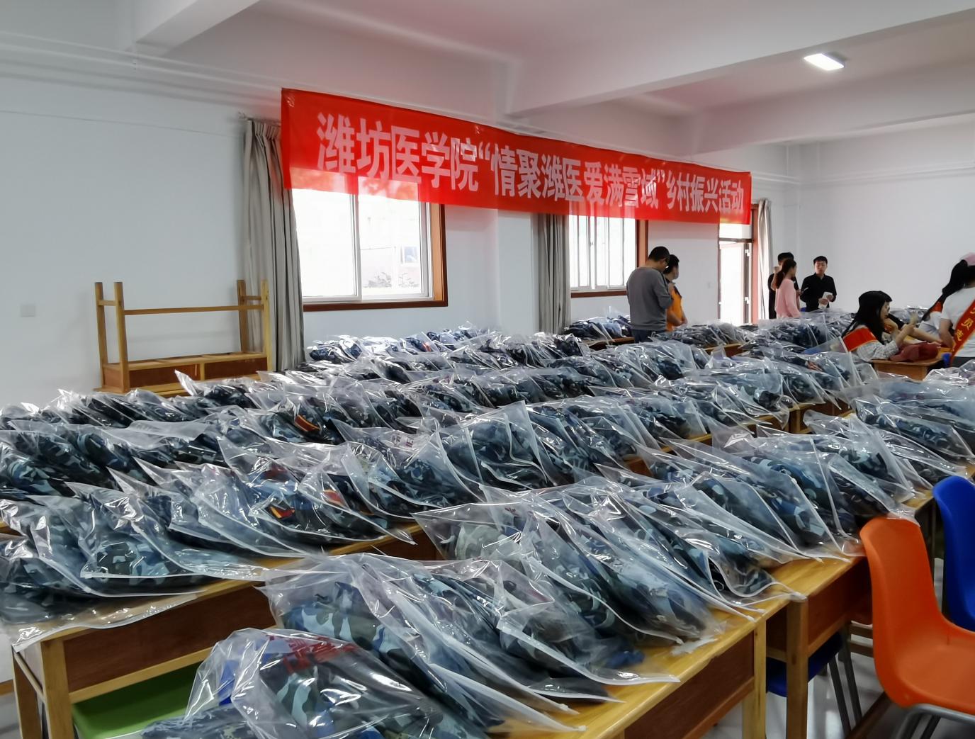 响应党中央提出的关于振兴乡村的号召,学校主动联系投身西藏自治区林芝市察隅县古玉乡政府工作的预防医学专业2012级王玮同学,了解其工作情况以及当地情况等,经过沟通后组织全校同学捐献个人军训服装,共募集200余套,有的捐赠同学填写了寄语卡片,包含潍医学子对西藏地区浓浓的情谊与祝福。预防医学学生党支部党员、入党积极分子积极参与,将军训服装整理打包,通过中国邮政装箱寄往西藏。