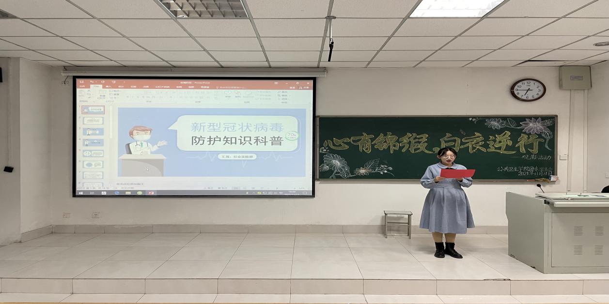 活动伊始,主持人向同学们科普了疫情防护相关知识,从科学认识新冠肺炎、如何做好自身健康防护等方面做了深入浅出的讲解,以科普教育的方式引导同学们正确佩戴口罩、减少聚集、保持安全社交距离、全员接种新冠疫苗、保障生活清洁卫生、积极参与体育锻炼等。随后,同学们共同观看防疫主题电影《中国医生》,电影讲述了2020年医务工作者在武汉一线抗击新冠肺炎疫情的感人事迹,以光影的形式致敬抗疫斗争中付出血汗乃至生命的中国医生。