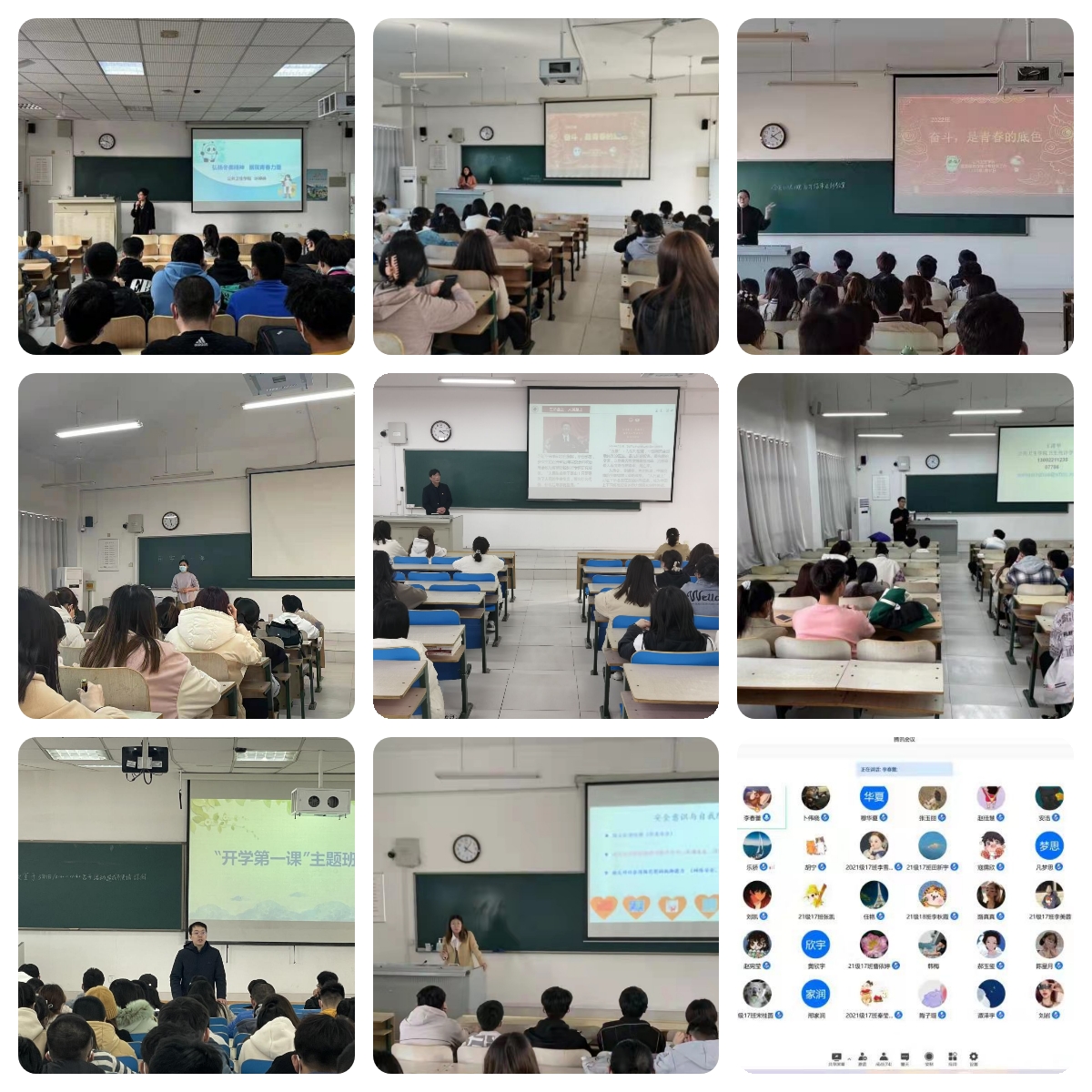 王培承以《胸怀赤子心,奋进新征程》为主题,从厚植家国情怀,走好新时代的长征路;传承潍医精神,做人民健康忠诚卫士;保持身心健康,德智体美劳全面发展三个方面,通过生动鲜活的感人事例为同学们讲述了疫情大考中的国家响应和全民行动,引导学生树立正确的人生观、价值观,厚植爱国主义情怀,强化制度认同。许婷婷以《弘扬冬奥精神,展现青春力量》为题,以冬奥会为主线,以思政为引领,以青春为底色,鼓励青年学生弘扬奥运精神、拼搏奋斗,展现青春力量。全体辅导员老师结合各专业学生特点,以思想政治教育、疫情防控宣教、心理健康教育、学风建设、反诈骗教育等内容,开展“开学第一课”主题班会活动。